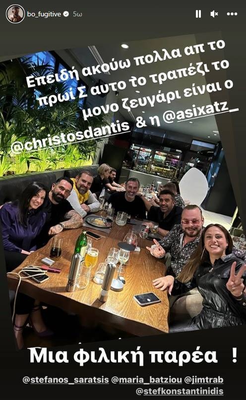Συγκεκριμένα ο Μπο, η Ασημίνα Χατζηανδρέου, ο Χρήστος Δάντης, ο δημοσιογράφος Στέφανος Κωνσταντινίδης δείπνισαν με παρέα και ανέβασαν στόρι στο Instagram.