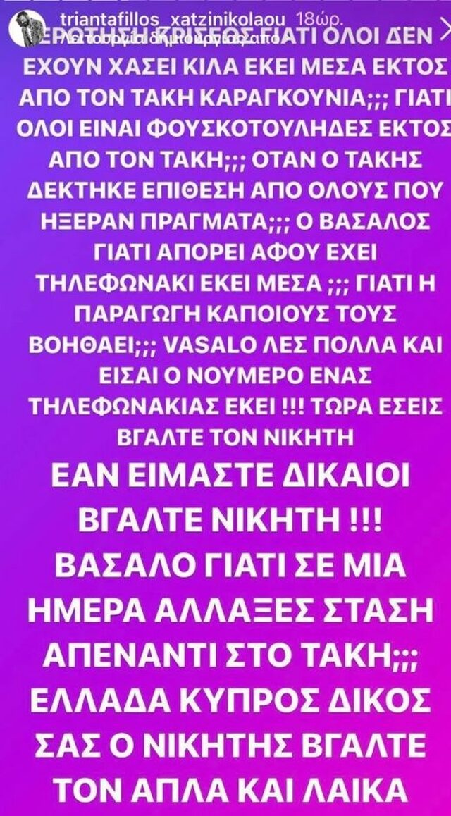Για το γεγονός πως δεν έχει αδυνατίσει κανένας στο ριάλιτι, έγραψε: «Ερώτηση κρίσεως, γιατί όλοι δεν έχουν χάσει κιλά εκεί μέσα εκτός από τον Τάκη Καραγκούνια; Γιατί όλοι φουσκοτούληδες εκτός από τον Τάκη; Όταν ο Τάκης δέχθηκε επίθεση από όλους που ήξεραν πράγματα; Ο Βάσαλος γιατί απορεί αφού έχει τηλεφωνάκι εκεί μέσα; Γιατί η παραγωγή κάποιους τους βοηθάει; Βασάλο λες πολλά και είσαι ο νούμερο 1 τηλεφωνάκιας εκεί!!! Τώρα εσείς βγάλτε τον νικητή. Εάν είμαστε δίκαιοι βγάλτε νικητή! Βασάλο γιατί σε μία ημέρα άλλαξες στάση απέναντι στον Τάκη; Ελλάδα, Κύπρος δικός σας ο νικητής βγάλτε τον απλά και λαϊκά».
