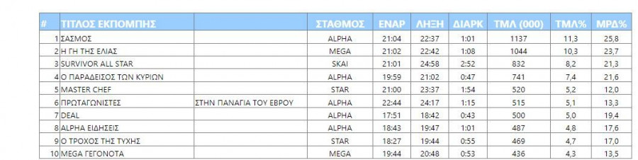 «Ο Παράδεισος των Κυριών» και το «MasterChef» ακολουθούν στο top 10 με 21,6% και 12%, αντίστοιχα.
