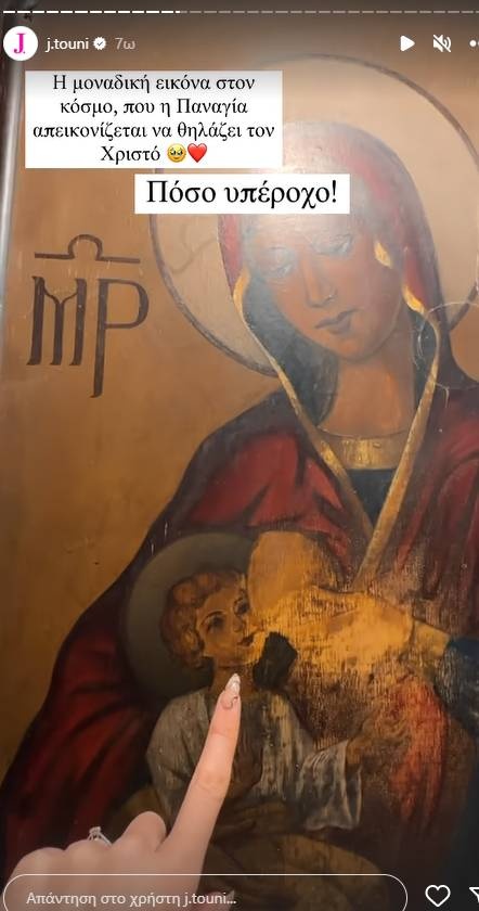 «Αυτή εδώ είναι η μοναδική εικόνα της Παναγίας στον κόσμο, στην οποία κάνει breastfeeding. Ταΐζει το μωράκι της από το στήθος. Θηλάζει και η Παναγία… σοκ» είπε συγκινημένη η Ιωάννα Τούνη.