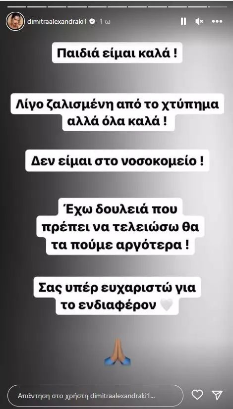 Όπως ενημέρωσε το γνωστό μοντέλο με ανάρτηση στα social media «λίγο ζαλισμένη από το χτύπημα αλλά όλα καλά. Δεν είμαι στο νοσοκομείο, έχω δουλειά που πρέπει να τελειώσω», έγραψε η Δήμητρα Αλεξανδράκη.