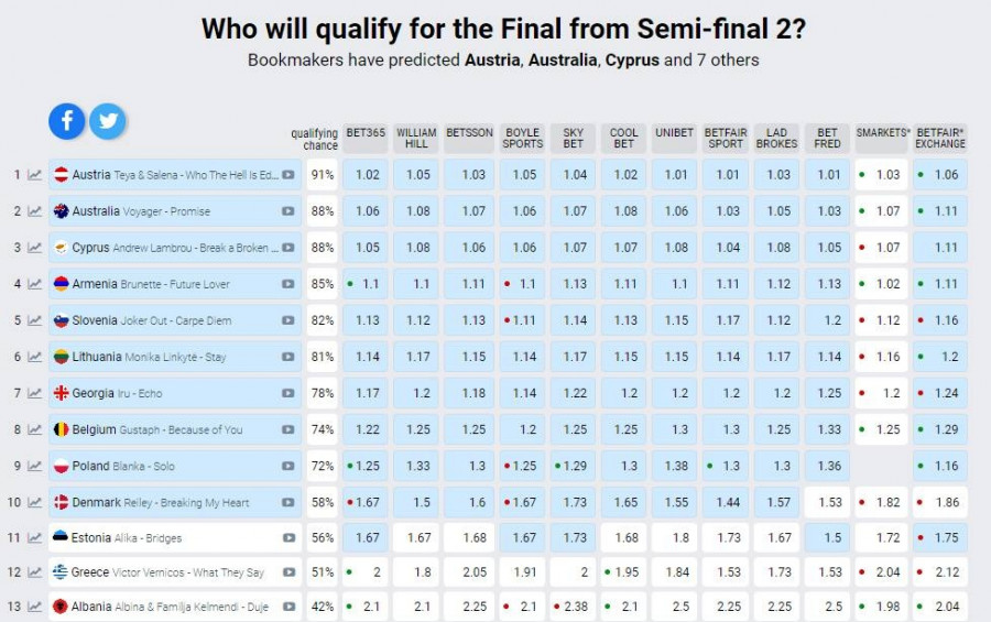 Ειδικότερα στον δεύτερο ημιτελικό που συμμετέχει η ελληνική αποστολή τα στοιχήματα την φέρνουν εκτός δεκάδας και συγκεκριμένα στην 12η θέση.