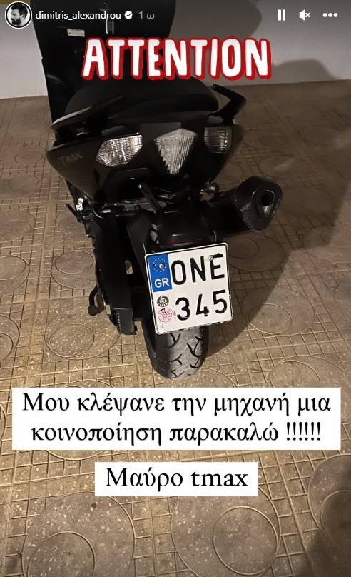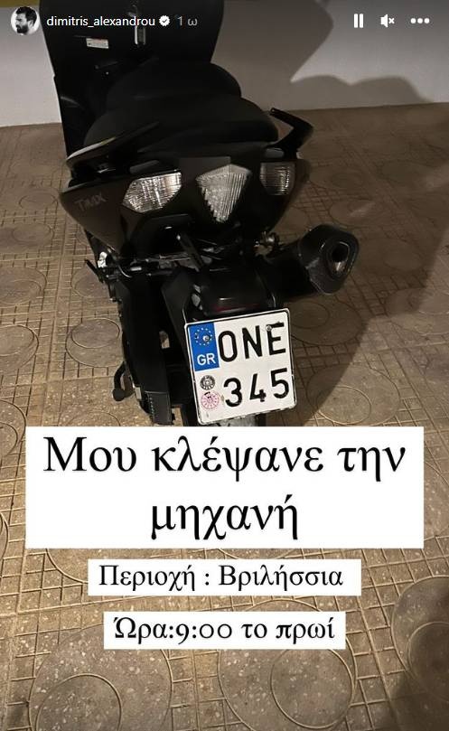 Με στόρι που ανέβασε ο ίδιος στο Instagram του δείχνει το μηχανάκι του και τις πινακίδες του και γράφει σε ποια περιοχή κλάπηκε το όχημά του και ποια ώρα.