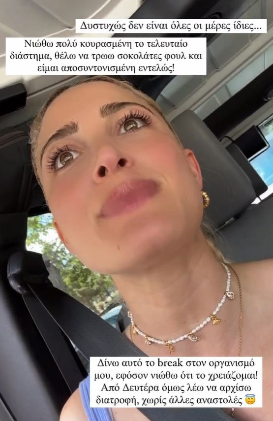 «Δυστυχώς δεν είναι όλες οι μέρες ίδιες. Νιώθω πολύ κουρασμένη το τελευταίο διάστημα, θέλω να τρώω σοκολάτες φουλ και είμαι αποσυντονισμένη εντελώς. Δίνω αυτό το break στον οργανισμό μου, εφόσον νιώθω ότι το χρειάζομαι. Από Δευτέρα όμως λέω να αρχίσω διατροφή χωρίς άλλες αναβολές».