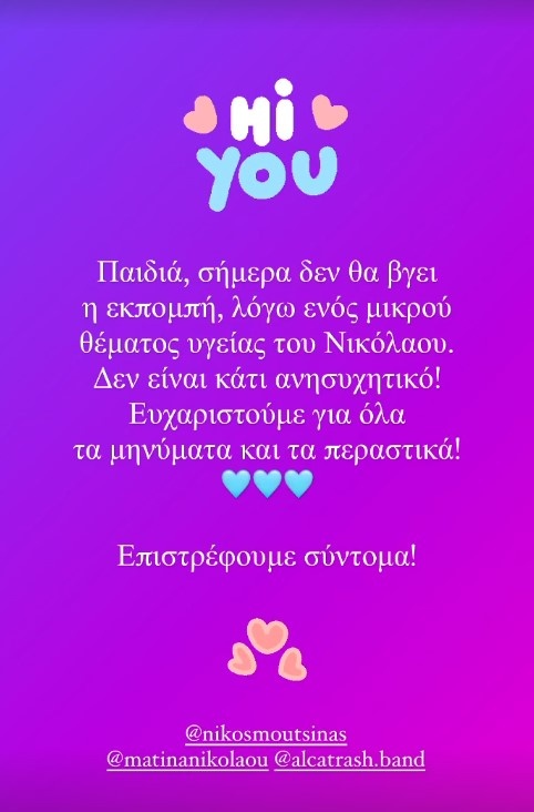 «Παιδιά, σήμερα δεν θα βγει η εκπομπή, λόγω ενός μικρού θέματος υγείας του Νικόλαου. Δεν είναι κάτι ανησυχητικό. Ευχαριστούμε για όλα τα μηνύματα και τα περαστικά. Επιστρέφουμε σύντομα», γράφτηκε χαρακτηριστικά.