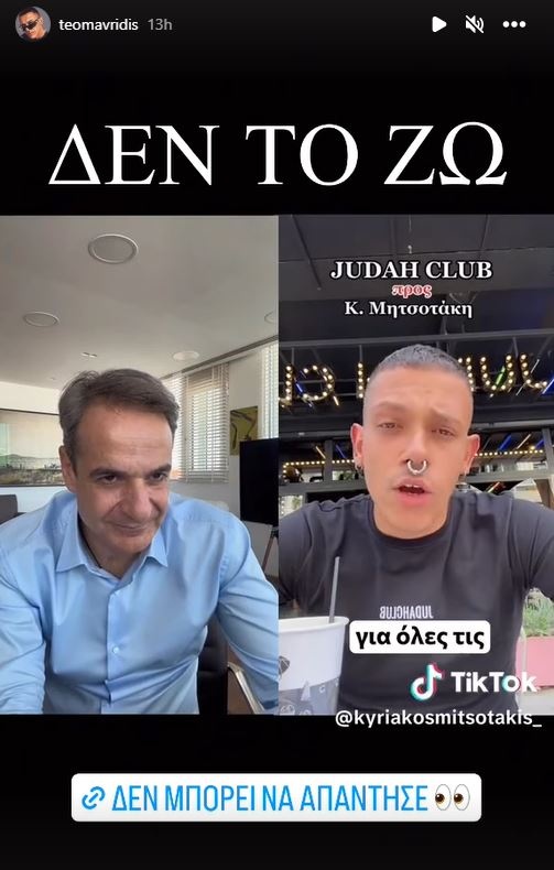 Ο επιχειρηματίας σε story του Instagram δηλώνει έκπληκτος που του απάντησε ο κ. Μητσοτάκης. «Δεν το ζω, δεν μπορεί να απάντησε», έγραψε.