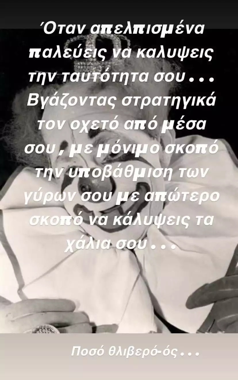 «Όταν απελπισμένα παλεύεις να καλύψεις την ταυτότητά του, βγάζοντας στρατηγικά τον οχετό από μέσα σου, με μόνιμο σκοπό την υποβάθμιση των γύρω σου με απώτερο σκοπό να καλύψεις τα χάλια σου. Πόσο θλιβερό-ος…», έγραψε χαρακτηριστικά σε insta story η Ευρυδίκη Παπαδοπούλου.
