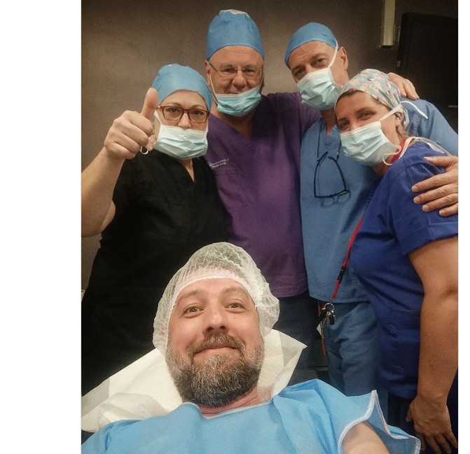 Ο γνωστός ηθοποιός φορώντας χειρουργική ρόμπα ποζάρει στον φακό χαμογελαστός μαζί με τους γιατρούς και το νοσηλευτικό προσωπικό.