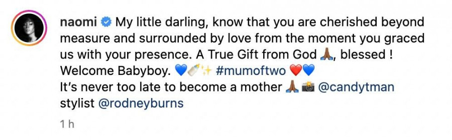 Στη λεζάντα γράφει: «Μικρή μου αγάπη, να ξέρεις ότι σε αγαπάμε πέρα από κάθε μέτρο και περιτριγυρίζεσαι από αγάπη από τη στιγμή που μας χάρισες με την παρουσία σου. Ένα αληθινό δώρο από τον Θεό, ευλογημένο! Καλώς ήρθες αγοράκι. Ποτέ δεν είναι αργά για να γίνεις μητέρα ».