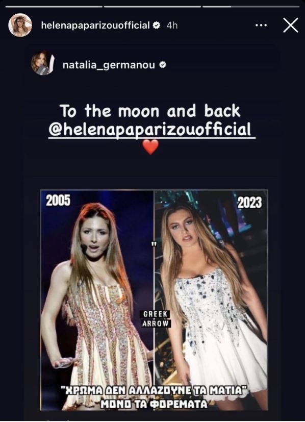 Παρόλα αυτή η εικόνα της θύμισε έντονα εκείνη του 2005, τόσο πολύ που η στιχουργός του My Number One, έβαλε δίπλα δίπλα τις φωτογραφίες της Έλενας με διαφορά 18 ετών και έγραψε «Χρώμα δεν αλλάζουνε τα μάτια, μόνο τα φορέματα».