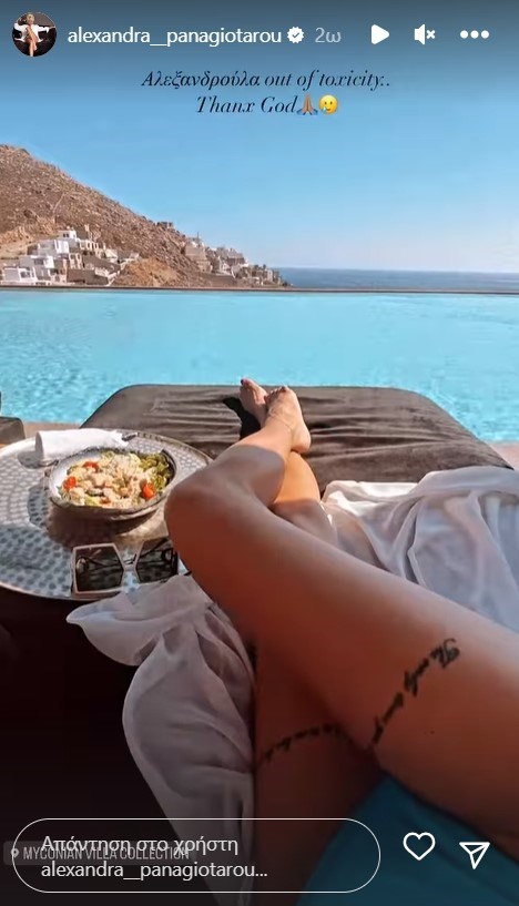 Συγκεκριμένα, η Αλεξάνδρα Παναγιώτου έκανε μία αινιγματική ανάρτηση στα κοινωνικά δίκτυα στην οποία έγραψε: «Αλεξανδρούλα out of toxicity. Ευχαριστώ, Θεέ μου» και τη συνόδευσε με μία φωτογραφία της, στην ξαπλώστρα και θέα το νησί.