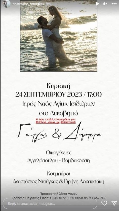 Το χαρμόσυνο γεγονός γνωστοποίησε ο δικηγόρος Αναστάσιος Ντούγκας ανεβάζοντας σε story στον προσωπικό του λογαριασμό στο Instagram το προσκλητήριο του γάμου του ζευγαριού, ο οποίος θα πραγματοποιηθεί στις 24 Σεπτεμβρίου στην Αθήνα.