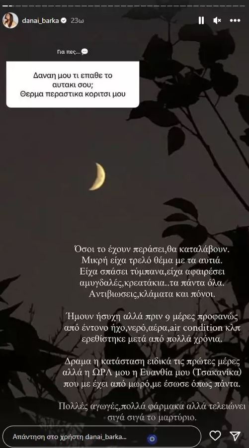 Πολλές αγωγές, πολλά φάρμακα, σιγά σιγά το μαρτύριο», απάντησε στο instagram η Δανάη Μπάρκα.