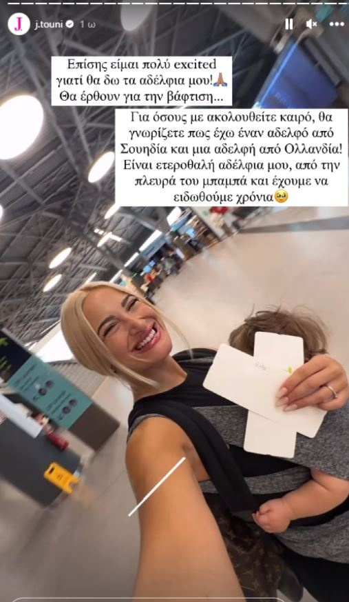 Μέσω Instagram stories, η Ιωάννα Τούνη ανέβασε ένα boomerang κλιπ με τον γιο της, από το αεροδρόμιο φανερά ενθουσιασμένη, γιατί θα συναντηθεί με τα ετεροθαλή αδέρφια της, έπειτα από χρόνια.