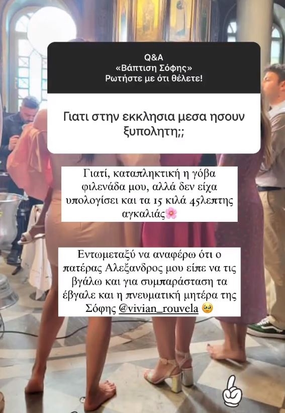 Μάλιστα, κάποιος ρώτησε την Νικολέττα Ράλλη για ποιον λόγο κατά τη διάρκεια της βάφτισης έβγαλε τις γόβες της και ήταν ξυπόλητη. Η παρουσιάστρια απάντησε: