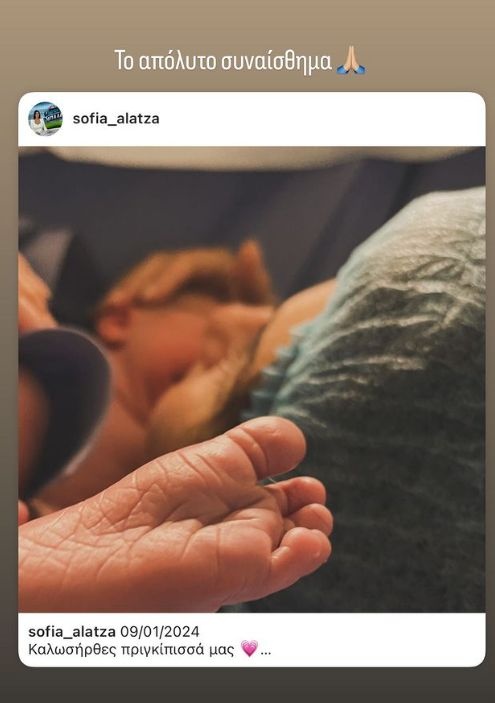 Την ευχάριστη είδηση έκανε γνωστή η παρουσιάστρια μέσα από τον προσωπικό της λογαριασμό στο Instagram, δημοσιεύοντας ένα στιγμιότυπο μέσα από το μαιευτήριο. «Καλώς ήρθες πριγκίπισσά μας. Η ζωή μου πήρε άλλο νόημα» έγραψε στη λεζάντα η Σοφία Αλατζά.