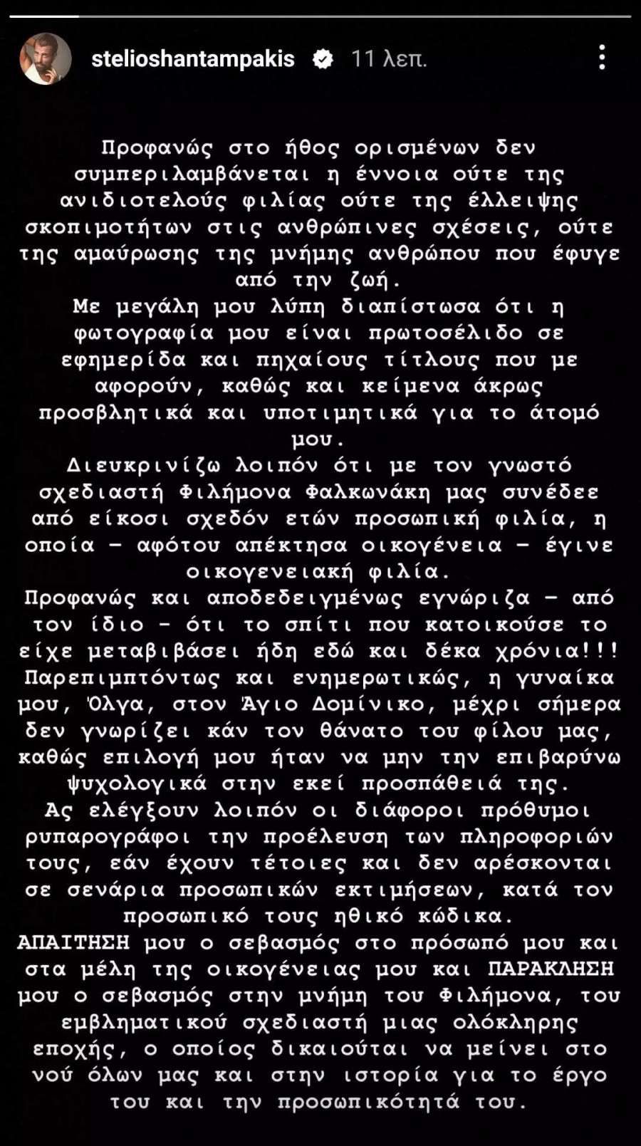 Ο Στέλιος Χανταμπάκης πραγματοποίησε μια ανάρτηση στα social media, διαψέυδοντας την είδηση για ένα πολυτελές διαμέρισμα, το οποίο θα του άφηνε ο σχεδιαστής μόδας, Φιλήμονας, μετά τον θάνατο του.