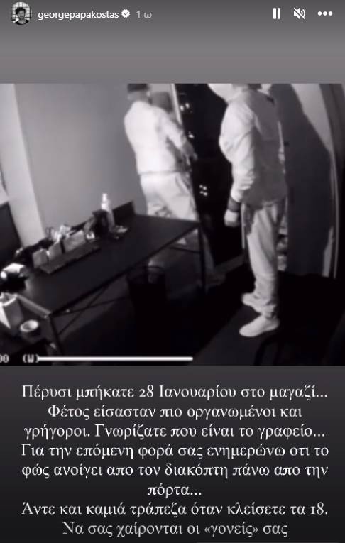 «Πέρυσι μπήκατε 28 Ιανουαρίου στο μαγαζί. Φέτος ήσασταν πιο οργανωμένοι και γρήγοροι. Γνωρίζατε που είναι το γραφείο…Για την επόμενη φορά σας ενημερώνω ότι το φως ανοίγει από τον διακόπτη πάνω από την πόρτα. Άντε και καμία τράπεζα όταν κλείσετε τα 18. Να σας χαίρονται οι “γονείς” σας», έγραψε ο Γιώργος Παπακώστας στο στόρι που ανέβασε.