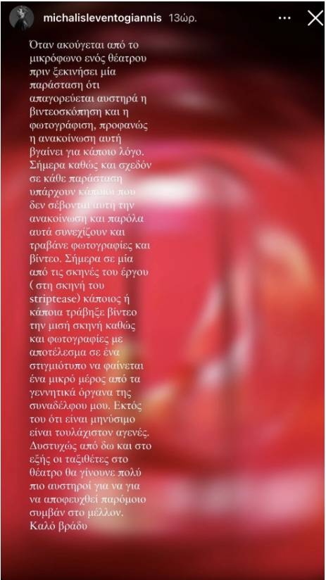 «Όταν ακούγεται από το μικρόφωνο ενός θεάτρου πριν ξεκινήσει μία παράσταση ότι απαγορεύεται αυστηρά η βιντεοσκόπηση και η φωτογράφιση, προφανώς η ανακοίνωση αυτή βγαίνει για κάποιο λόγο. Σήμερα, καθώς και σχεδόν σε κάθε παράσταση υπάρχουν κάποιοι που δε σέβονται αυτή την ανακοίνωση και παρόλα αυτά συνεχίζουν και τραβάνε φωτογραφίες και βίντεο. Σήμερα σε μία από τις σκηνές του έργου (στη σκηνή του striptease) κάποιος ή κάποια τράβηξε βίντεο την μισή σκηνή καθώς και φωτογραφίες με αποτέλεσμα σ’ ένα στιγμιότυπο να φαίνεται ένα μικρό μέρος από τα γεννητικά όργανα της συναδέλφου μου. Εκτός του ότι είναι μηνύσιμο, είναι τουλάχιστον αγενές. Δυστυχώς από εδώ και στο εξής οι ταξιθέτες στο θέατρο θα γίνουνε πολύ πιο αυστηροί για να αποφευχθεί παρόμοιο συμβάν στο μέλλον. Καλό βράδυ», έγραψε στο insta story του ο Μιχάλης Λεβεντογιάννης.
