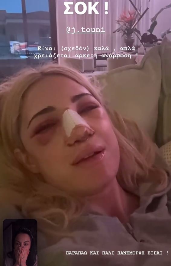«Είναι σχεδόν καλά, απλά χρειάζεται αρκετή ανάρρωση», έγραψε η Δήμητρα Αλεξανδράκη με την Ιωάννα Τούνη να φαίνεται αρκετά ταλαιπωρημένη.