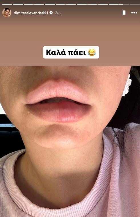 Συγκεκριμένα, η Δήμητρα Αλεξανδράκη είπε: «Η καλή μέρα από το πρωί φαίνεται. Πήγα να περάσω από κάπου που είχε αυτές τις μπάρες που κατεβαίνουν για να μην περνάνε αυτοκίνητα. Ήταν σηκωμένη, περνάω και δε με είδαν. Κατέβηκε η μπάρα και προσγειώθηκε στο κεφάλι μου. Σκίστηκαν λίγο τα χείλη μου, έχω πρηστεί την έχω ακούσει, καλά είμαι, σιδερένιο το κεφαλάκι. Είμαι σαν να έχω κάνει αποτυχημένο υαλουρονικό».