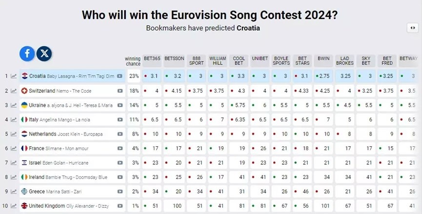 Άνοδο παρουσίασε η Κροατία, η οποία σκαρφάλωσε στην 1η θέση ενώ δεύτερο μεγάλο φαβορί φαίνεται ότι είναι η Ελβετία.