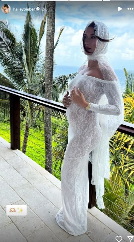 Σε αυτές, η Χέιλι ποζάρει με ένα λευκό φόρεμα, που παραπέμπει σε νυφικό, ενώ αποκαλύπτεται η φουσκωμένη της κοιλιά. Σε ένα νέο στιγμιότυπο που δημοσίευσε η ίδια στον προσωπικό της λογαριασμό στο Instagram, θέλησε να δώσει στο κοινό της μια καλύτερη εικόνα της εγκυμοσύνης της.
