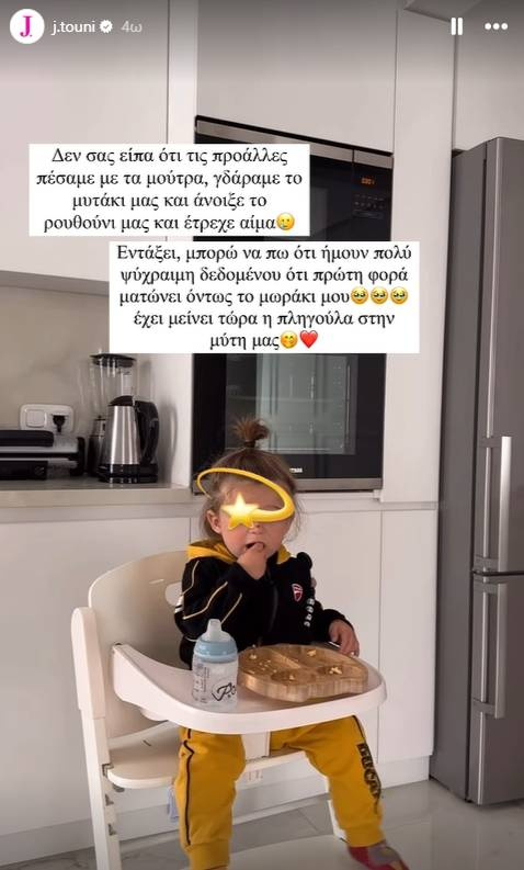 Όπως αποκάλυψε μέσα από στόρι της στο Instagram ο γιος της έπεσε με τα μούτρα με αποτέλεσμα να ανοίξει η μύτη του και να ματώσει. Η Ιωάννα Τούνη παραδέχθηκε ότι ήταν ψύχραιμη.