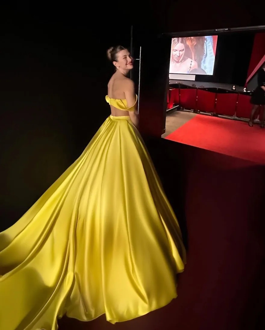 Η Κλέλια Ανδριολάτου επέλεξε μία κίτρινη μονόχρωμη δημιουργία άκρως εντυπωσιακή και αποκαλυπτική, ενώ πόζαρε χαμογελαστή στο κόκκινο χαλί. Τα μαλλιά της τα είχε τραβήξει σε έναν σικάτο κότσο, ενώ φόρεσε ένα κατακόκκινο κραγιόν.
