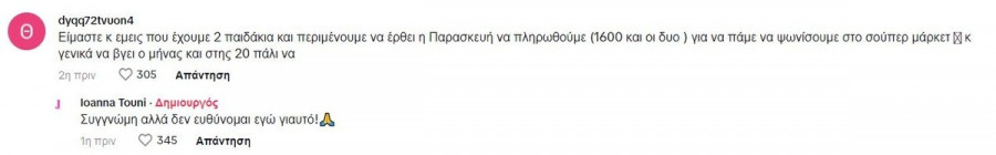 «Είμαστε κ εμεις που έχουμε 2 παιδάκια και περιμένουμε να έρθει η Παρασκευή να πληρωθούμε (1600 και οι δυο ) για να πάμε να ψωνίσουμε στο σούπερ μάρκετ και γενικά να βγει ο μήνας», της έγραψε ένας χρήστη του ΤikTok με την Ιωάννα Τούνη να απαντά «Συγγνώμη αλλά δεν ευθύνομαι εγώ γιαυτό».