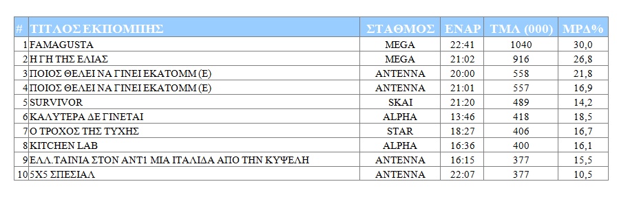 Συγκεκριμένα, στην πρώτη θέση βρέθηκε το «Famagusta» που καθήλωσε στο φινάλε του δεύτερου κύκλου. Η παραγωγή μυθοπλασίας συγκέντρωσε 30% στο σύνολο, με 1.040.000 τηλεθεατές να βλέπουν MEGA και να συγκινούνται με τις καθηλωτικές σκηνές. «Η Γη της Ελιάς», επίσης στο μεγάλο κανάλι, έκανε 26,8% στο σύνολο, ποσοστό πολύ υψηλό αν αναλογιστεί κάποιος ότι η σειρά βρίσκεται στον αέρα τρία χρόνια. Μάλιστα, είναι από τα σίριαλ που έχει πάρει το πράσινο φως για του χρόνου.