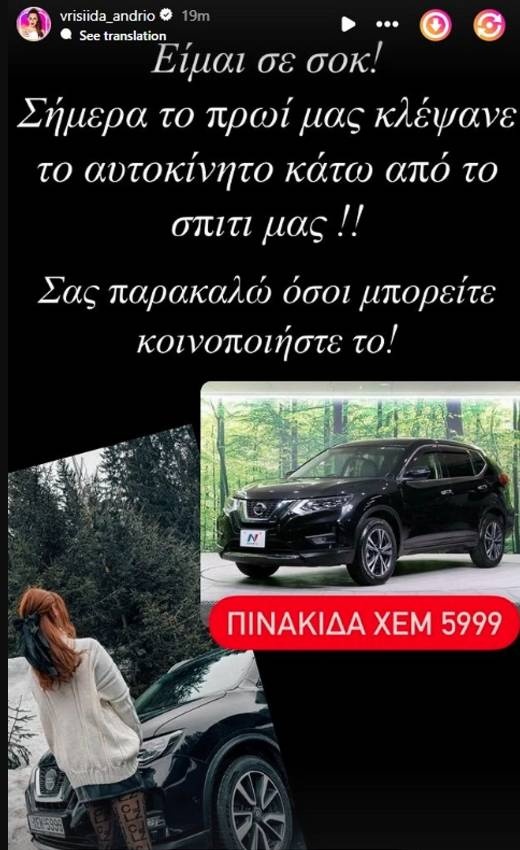 «Είμαι σε σοκ! Σήμερα το πρωί μας κλέψανε το αυτοκίνητο κάτω από το σπίτι μας! Σας παρακαλώ όσοι μπορείτε κοινοποιείστε το!» ανέφερε η Βρισηίδα Ανδριώτου στους followers της σε περίπτωση που καταφέρουν να τη βοηθήσουν.