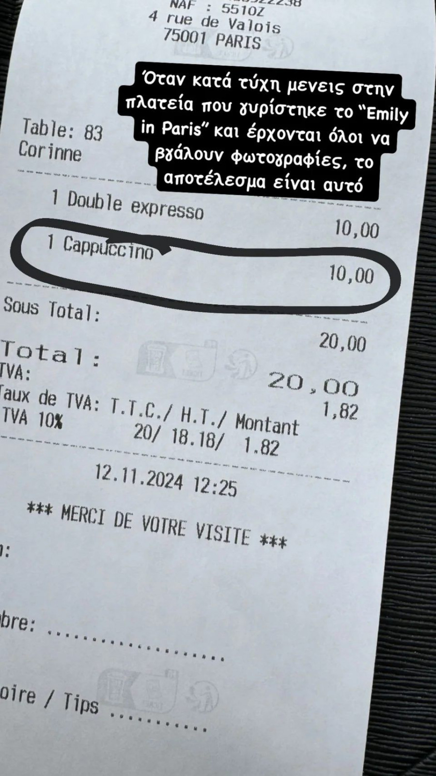 «Όταν κατά τύχη μένεις στην πλατεία που γυρίστηκε το Emily in Paris και έρχονται όλοι να βγάλουν φωτογραφίες, το αποτέλεσμα είναι αυτό», έγραψε χαρακτηριστικά, ενώ στην απόδειξη φαίνεται πως για 2 καφέδες πλήρωσε συνολικά 20 ευρώ.