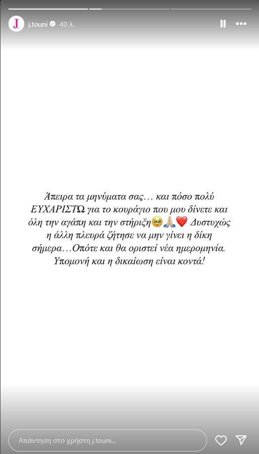 «Δυστυχώς η άλλη πλευρά ζήτησε να μην γίνει η δίκη σήμερα. Οπότε και θα οριστεί νέα ημερομηνία», έγραψε η Ιωάννα Τούνη σε ανάρτησή της