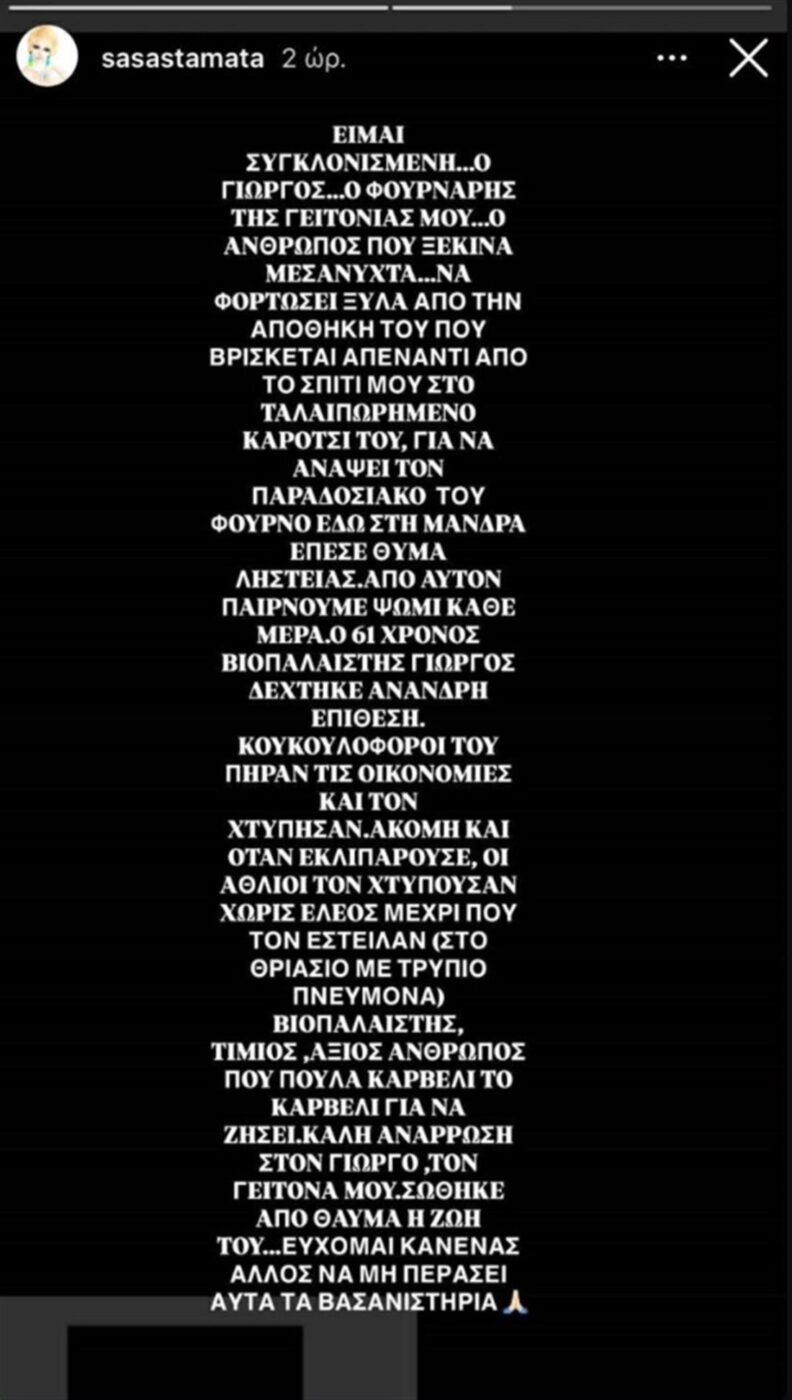 Η Σάσα Σταμάτη προχώρησε σε μια μακροσκελή ανάρτηση στον προσωπικό της λογαριασμό στο Instagram όπου περιέγραψε τι συνέβη στον άνθρωπο που διατηρεί τον φούρνο της γειτονιάς της. Ο άτυχος άνδρας έπεσε θύμα ληστείας και άγριας επίθεσης, με συνέπεια να μεταφερθεί στο νοσοκομείο.