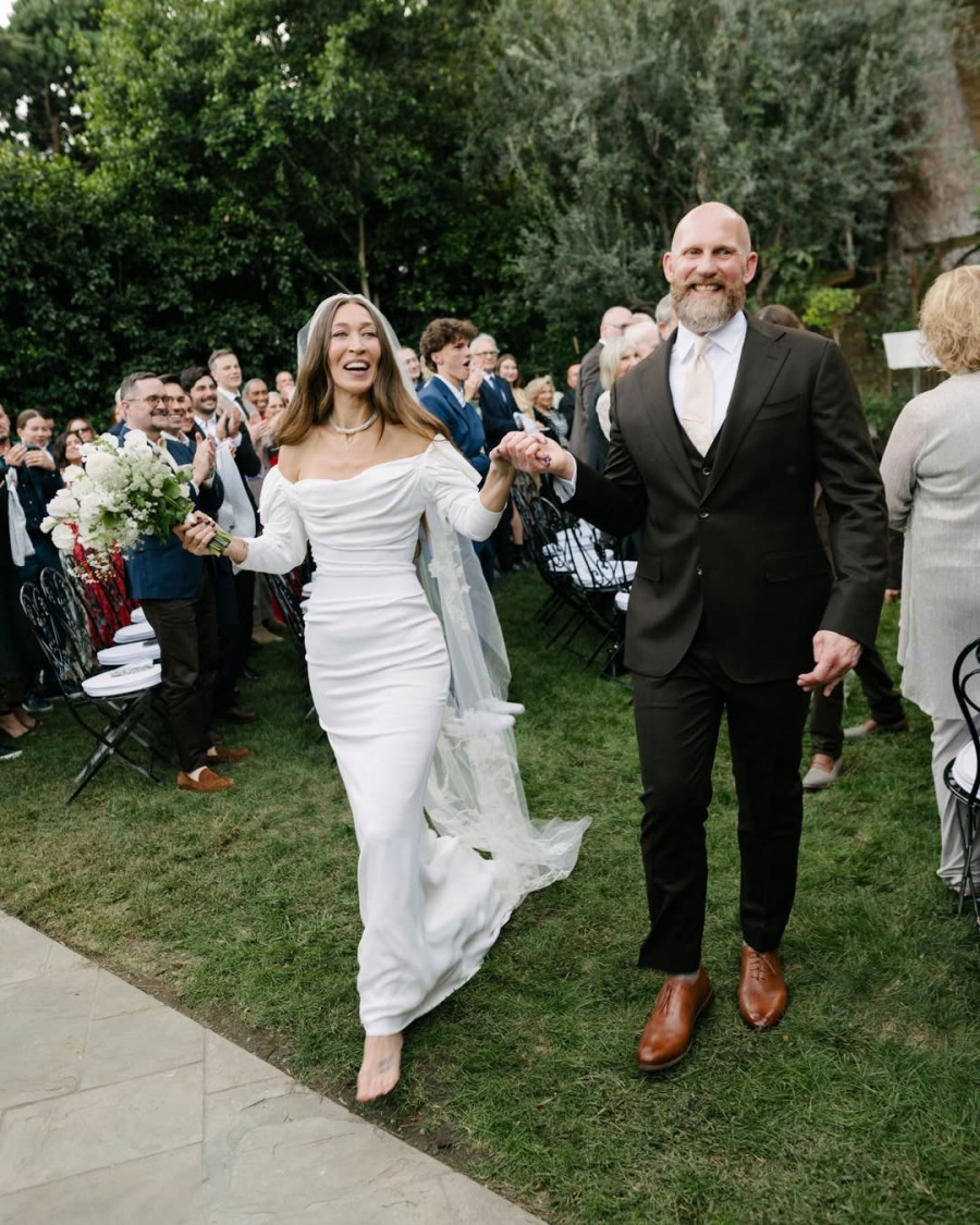 Η 42χρονη νύφη εντυπωσίασε με ένα vintage λευκό νυφικό της Βίβιαν Γουέστγουντ, το οποίο συνδύασε με κοσμήματα της Dorsey και μια χειροποίητη χρυσή βέρα από τη Sofia Kaman.