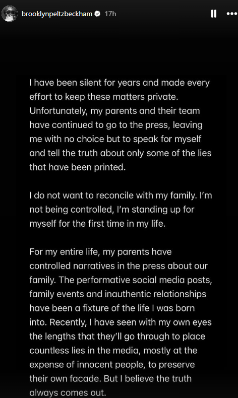 Παρά τις - όπως ο ίδιος αναφέρει - επανειλημμένες προσπάθειες επαναπροσέγγισης, η σχέση του Μπρούκλιν Μπέκαμ με τους γονείς του φαίνεται να παρέμεινε τεταμένη. Με τις νέες του δηλώσεις, επιβεβαιώνει ξεκάθαρα τη στάση του, δηλώνοντας πως «δεν θέλω να συμφιλιωθώ με την οικογένειά μου», επιλογή που, όπως τονίζει, έγινε προκειμένου να προστατεύσει τον εαυτό του και τον γάμο του.