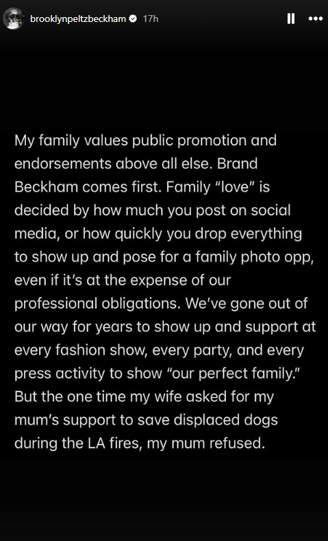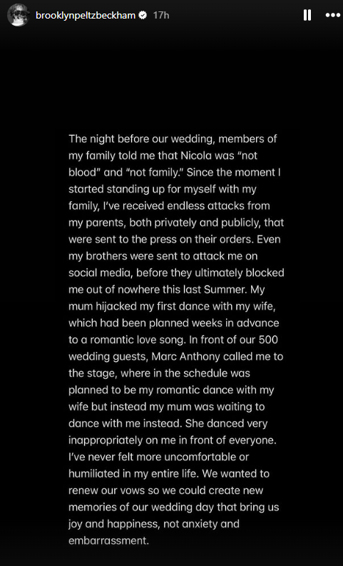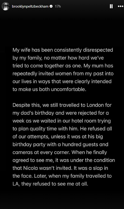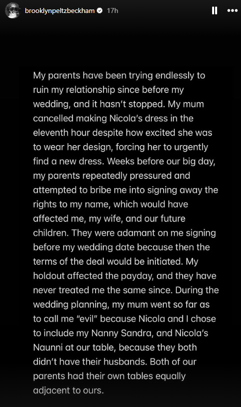 Σε νέα, εκτενή τοποθέτησή του μέσω Instagram Stories, ο Μπρούκλιν Μπέκαμ ξεκαθαρίζει τη στάση του απέναντι στη σύζυγό του, Νίκολα Πέλτζ Μπέκαμ, απαντώντας ευθέως στο αφήγημα ότι εκείνη ελέγχει τις αποφάσεις του, μετά τα συνεχή δημοσιεύματα που αφορούν τη ρήξη του με τους γονείς του, Ντείβιντ και Βικτόρια Μπέκαμ.