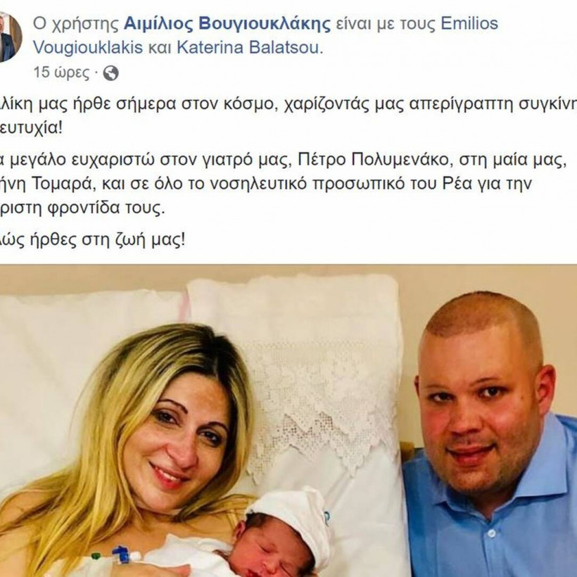 Ο αγαπημένος ανιψιός της αξέχαστης ηθοποιού, Αιμίλιος Βουγιουκλάκης, έγινε πατέρας και δημοσίευσε φωτογραφία με τη νεογέννητη κορούλα του μέσα από το μαιευτήριο, αποκαλύπτοντας το ευχάριστο γεγονός.