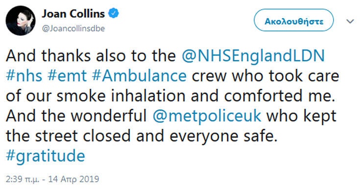 Στιγμές αγωνίας έζησε η ηθοποιός Τζόαν Κόλινς όταν ξέσπασε φωτιά στο σπίτι που μένει στο Λονδίνο.
