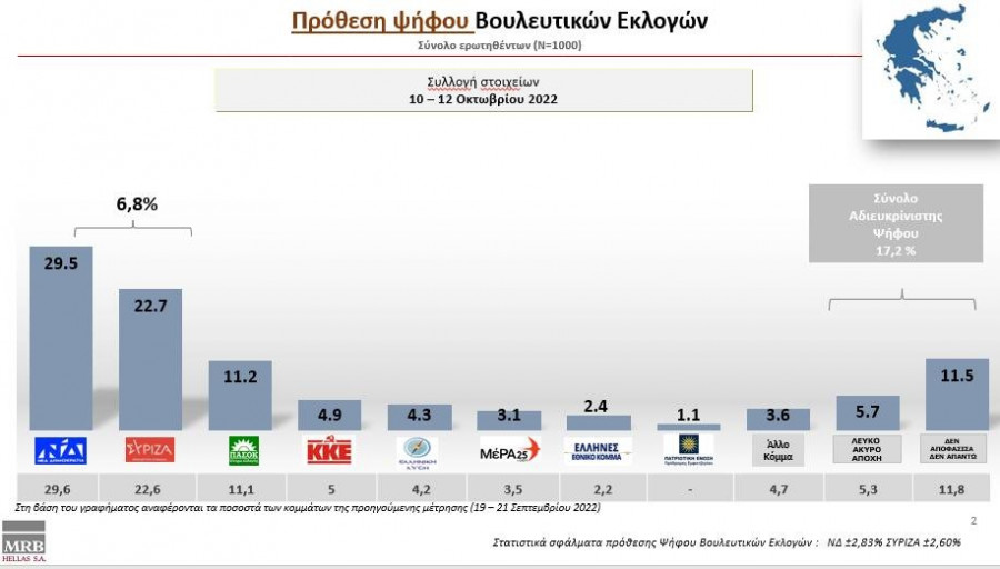 ΔΕΙΤΕ ΕΔΩ ΟΛΟΚΛΗΡΗ ΤΗ ΔΗΜΟΣΚΟΠΗΣΗ ΤΗΣ MRB ΓΙΑ ΤΟ NEWSBOMB.GRΣτο βασικότερο ερώτημα της δημοσκόπησης, για την πρόθεση ψήφου, η Νέα Δημοκρατία δείχνει να αντέχει στις πιέσεις που δέχεται εξαιτίας της ενεργειακής κρίσης, καταφέρνοντας να διατηρήσει τα δημοσκοπικά της ποσοστά σε μια «απόσταση ασφαλείας» από τον ΣΥΡΙΖΑ, που μέχρι στιγμής δεν καταφέρνει να κερδίσει πόντους από τη φθορά του κυβερνώντος κόμματος. Σύμφωνα με τον Δημήτρη Μαύρο, αυτό που εμφανίζει σταθεροποίηση στα δημοσκοπικά του στοιχεία είναι το ΠΑΣΟΚ/ΚΙΝΑΛ.