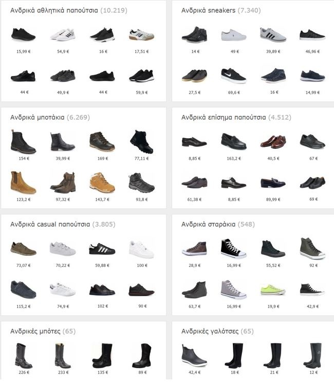 Από ανδρικά παπούτσια όπως αθλητικά, μποτάκια, επίσημα υποδήματα, σταράκια, μοκασίνια, sneakers, casual σε υποδήματα για γυναίκες, δηλαδή, μποτάκια, μπότες, γόβες, αθλητικά, sneakers, πλατφόρμες, oxfords, πέδιλα, μπαλαρίνες, σανδάλια -εκτός από επώνυμα και παπούτσια φθηνά, σε προσφορές ή με μεγάλη έκπτωση. H ποικιλία είναι μεγάλη σε κάθε κατηγορία, ακόμη και στα παιδικά παπούτσια με χιλιάδες αθλητικά,