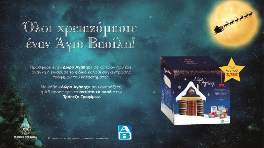 Με μόλις 3,75 ευρώ, λοιπόν, θα αποκτήσετε ένα «Δώρο Αγάπης» το οποίο είτε θα προσφέρετε μόνοι σας σε κάποιο πρόσωπο που γνωρίζετε και το έχει ανάγκη, είτε θα τοποθετήσετε στο ειδικό καλάθι συγκέντρωσης τροφίμων του καταστήματος ΑΒ Βασιλόπουλος που θα επισκεφτείτε και η γνωστή αλυσίδα σουπερμάρκετ, θα φροντίσει ώστε αυτό να φτάσει στο τραπέζι εκείνων που πραγματικά το χρειάζονται. Αξίζει, μάλιστα, να σημειώσουμε ότι για κάθε «Δώρο Αγάπης» που αγοράζετε, η ΑΒ προσφέρει το αντίστοιχο ποσό στην Τράπεζα Τροφίμων!