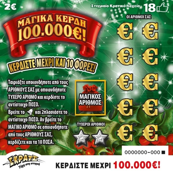 Τη Χριστουγεννιάτικη γκάμα του ΣΚΡΑΤΣ συμπληρώνουν δύο ακόμα παιχνίδια, τα «Μαγικά Κέρδη 100.000€!» και τα «Μαγικά Κέρδη 500.000€!», που μοιράζουν έπαθλα έως και 100.000 ευρώ και 500.000 ευρώ, αντίστοιχα.