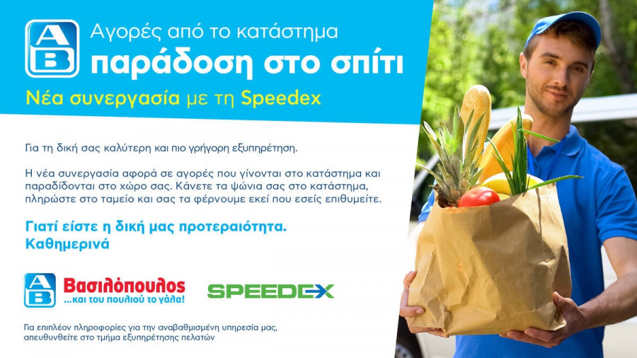 Στο πλαίσιο αυτό, εγκαινιάζουμε μια νέα συνεργασία με τη SPEEDEX και ενισχύουμε την υπηρεσία της “παράδοσης στο σπίτι”, για τις αγορές που εσείς κάνετε από το κατάστημα. Η ενισχυμένη υπηρεσία για «παράδοση στο σπίτι» ξεκινάει σήμερα και θα εφαρμοστεί σε 129 καταστήματα ΑΒ στην Αττική.