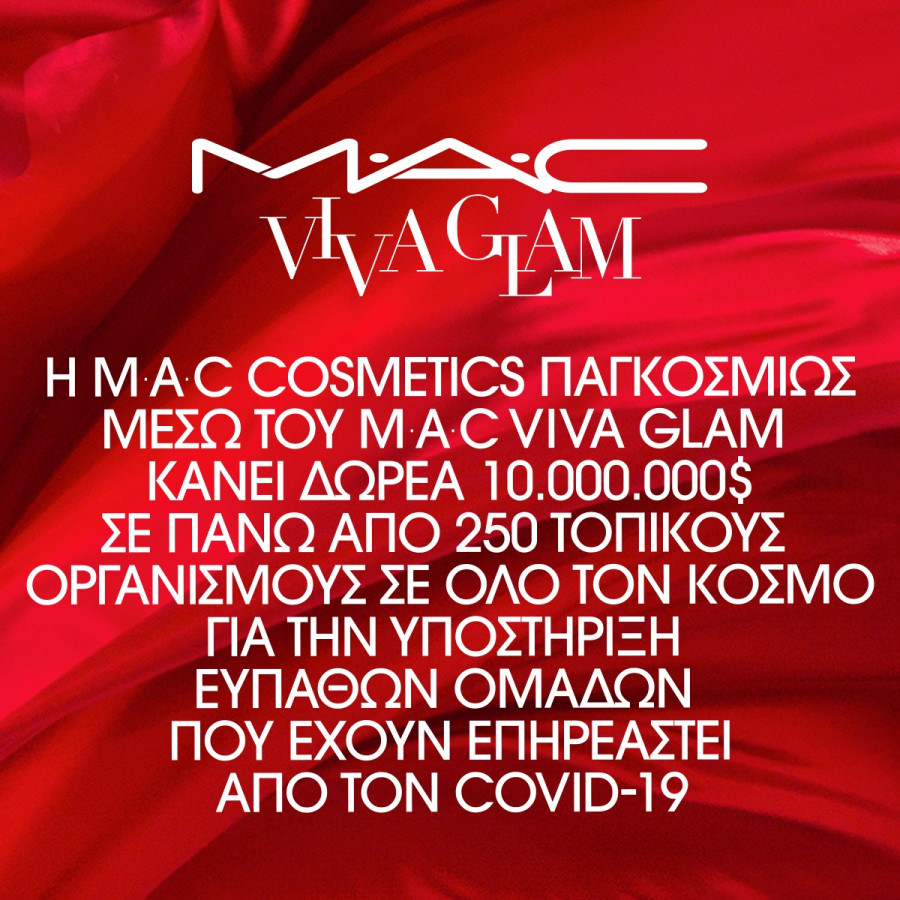 Η M·A·C Cosmetics ανακοινώνει ότι μέσω της μακροχρόνιας πρωτοβουλίας της, VIVA GLAM, η οποία υποστηρίζει οργανισμούς και δράσεις που παρέχουν βοήθεια και υπηρεσίες σε βασικές ανάγκες ευπαθών ομάδων πληθυσμού, προσφέρει 10 εκατομμύρια δολάρια σε πάνω από 250 τοπικούς οργανισμούς παγκοσμίως, οι οποίοι βρίσκονται στην πρώτη γραμμή βοηθώντας ανθρώπους που βρίσκονται σε υψηλό κίνδυνο, κατά τη διάρκεια της πανδημίας του COVID-19.