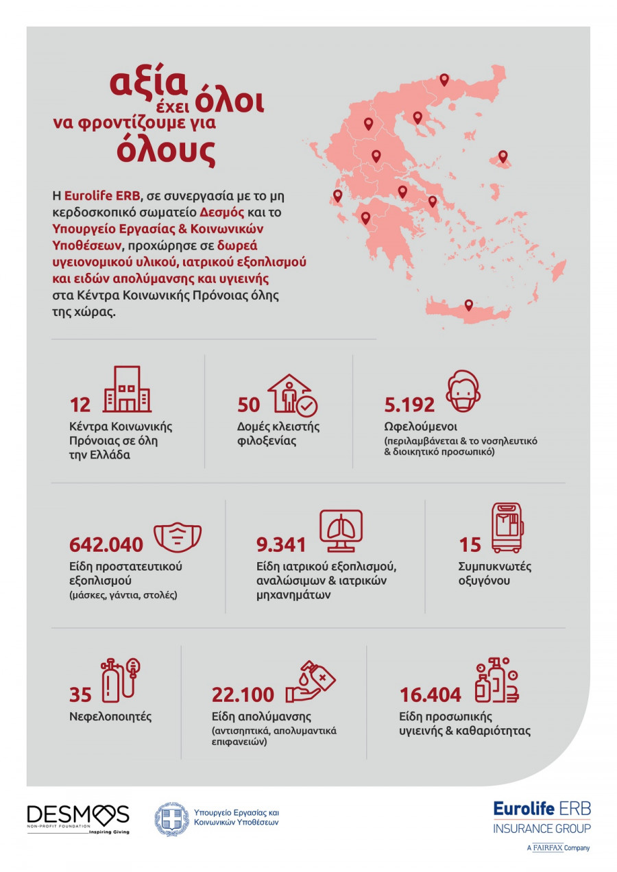 Συνολικά, μέσω της δωρεάς του Ομίλου Eurolife ERB, έχουν διατεθεί για χρήση από το ιατρικό και νοσηλευτικό προσωπικό των Κέντρων Κοινωνικής Πρόνοιας 9.341 είδη ιατρικών μηχανημάτων, ιατρικού εξοπλισμού και αναλώσιμων, καθώς και 642.040 είδη ατομικού προστατευτικού εξοπλισμού, όπως μάσκες, γάντια και στολές εργασίας. Επίσης, έχουν διαμοιραστεί 22.100 είδη απολύμανσης και 16.404 είδη καθαριότητας και προσωπικής υγιεινής, όπως αντισηπτικά και απολυμαντικά, για την καλύτερη περιποίηση των χώρων, στους οποίους φιλοξενούνται ευπαθείς ομάδες υψηλού κινδύνου.