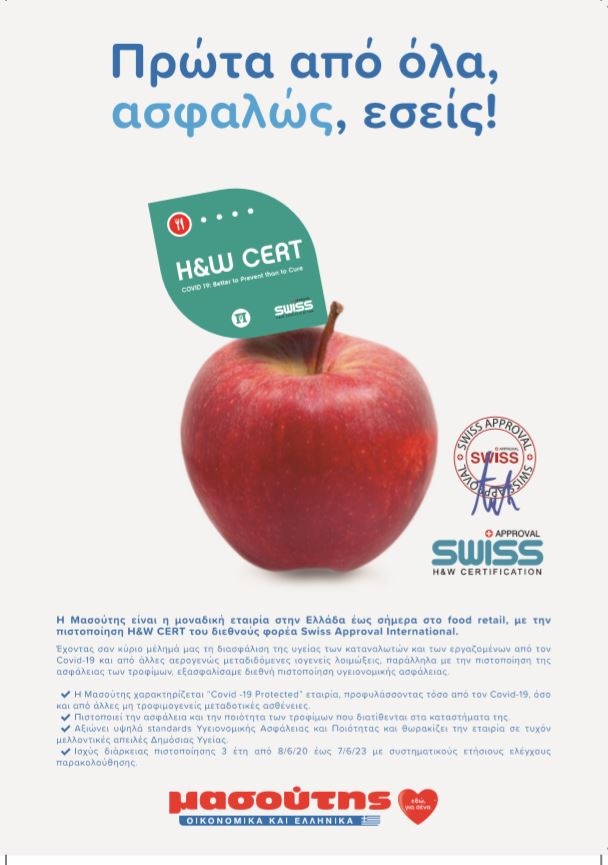 Υπάρχει μια αμιγώς ελληνική οικογενειακή εταιρία, που είναι η μοναδική στο food retail που έχει  λάβει την πιστοποίηση «H&W CERT» για τρία χρόνια από τον φορέα Swiss Approval International για τη διασφάλιση της υγείας των καταναλωτών και των εργαζομένων από τον Covid-19 και από άλλες ιογενείς λοιμώξεις, που μεταδίδονται αερογενώς.