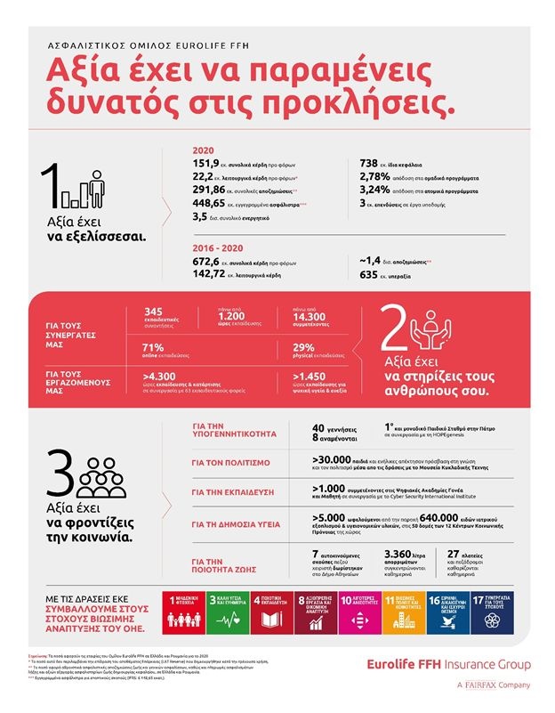 Θετικές οικονομικές επιδόσεις, δράσεις με ισχυρό κοινωνικό αποτύπωμα και επενδυτικές στρατηγικές που δημιουργούν υπεραξία χαρακτήρισαν το 2020 για τον Όμιλο Eurolife FFH, μέλος της Fairfax Financial Holdings Limited. Σε μία χρονιά γεμάτη προκλήσεις και σε ένα ασταθές κοινωνικοοικονομικό περιβάλλον, ο Ασφαλιστικός Όμιλος Eurolife FFH διατήρησε την ηγετική του θέση στην αγορά. Παράλληλα, συνέχισε σταθερά να εφαρμόζει το πλάνο ανάπτυξής του, ενώ μέσα από στοχευμένες πρωτοβουλίες αποδεικνύει καθημερινά ότι αξία έχει να βρίσκεται στο πλευρό των ανθρώπων, ενδυναμώνοντάς τους να καταφέρνουν περισσότερα.