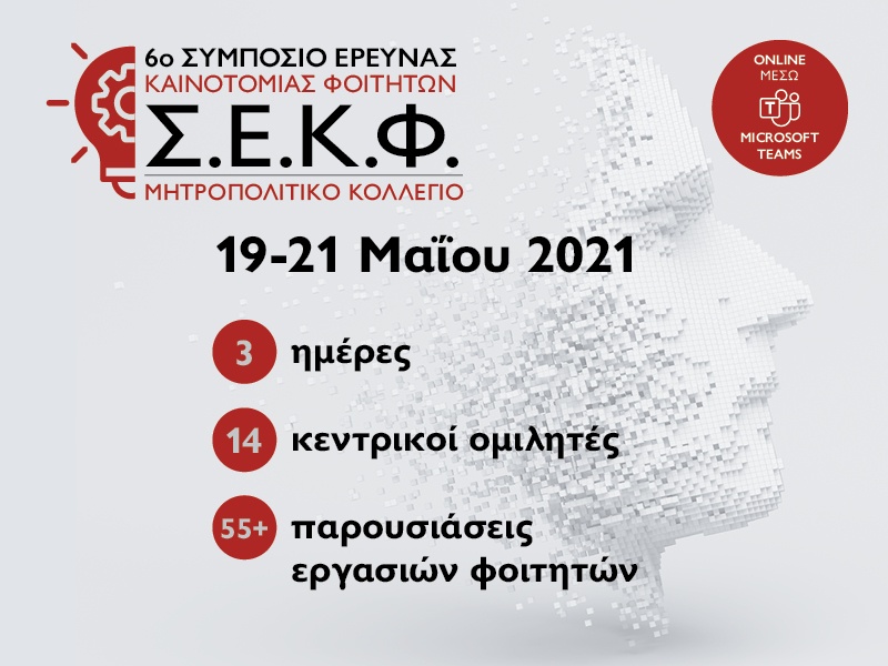 Το Μητροπολιτικό Κολλέγιο διοργανώνει για 6η συνεχή χρονιά το Συμπόσιο Έρευνας και Καινοτομίας Φοιτητών, ένα ετήσιο forum διάδοσης ιδεών, θεωριών και πειραματικής έρευνας. Η φετινή διοργάνωση θα πραγματοποιηθεί διαδικτυακά, μέσω Microsoft Teams, από την Τετάρτη 19 Μαΐου έως και την Παρασκευή 21 Μαΐου, με τη συμμετοχή 14 κεντρικών ομιλητών και την παρουσίαση περισσότερων από 55 ερευνητικών εργασιών φοιτητών και αποφοίτων.